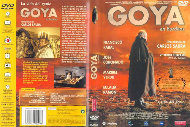 Las tres últimas aproximaciones cinematográficas a Goya han sido comentadas por Mercedes Águeda Villar (“Goya en el relato cinematográfico”, Cuadernos de Historia Contemporánea, 23, 2001) y Eva Otero Vázquez, de la Universidad de Santiago de Compostela (“Francisco de Goya en el cine”). De su lectura se puede deducir que podemos clasificarlas atendiendo al criterio que utilizan al tratar la figura del pintor. Por un lado, en 1999 se estrenaba “Goya en Burdeos”, una reflexión sobre la personalidad y el arte del pintor que Antonio Saura dedicó a su propio hermano, recientemente fallecido y admirador de Goya. Según Eva Otero, la película se inspira en el libro de Jacques Fauque y Ramón Villanueva Echevarría “Goya y Burdeos: 1824-1828”, consultado por el cineasta en Costa Rica mientras rodaba “El Dorado”.